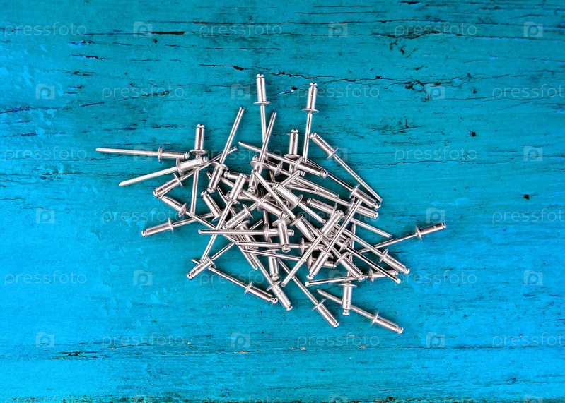 На синем столе лежит небольшая куча металлических заклепок. Изделия из металла. Крепеж. Аксессуары для заклепочного пистолета