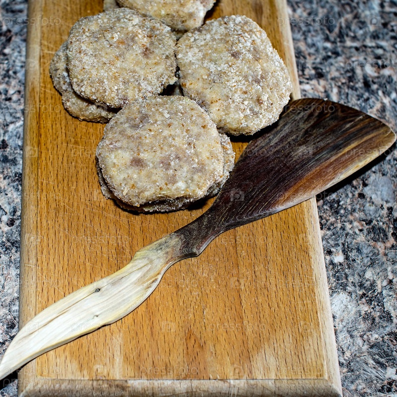 Полуфабрикаты лежат на деревянной разделочной доске