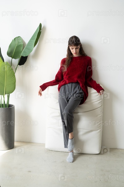 Молодая красивая женщина позирует в красном свитере в студии, стоит