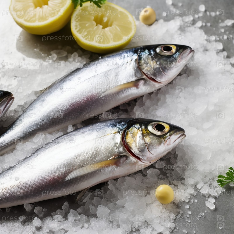 Две сардины с кусочками льда и лимоном на столе. Генеративный ИИ
