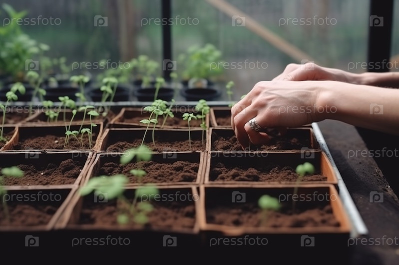 Руки сажают саженцы зеленых помидоров на подушку в теплице. генеративный ИИ Иллюстрация высокого качества