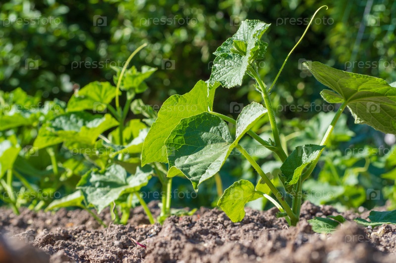 Выращивание огурцов в открытом грунте. Рассада огурцов в саду на грядке на фоне зелени. Маленькие зеленые кусты огурца