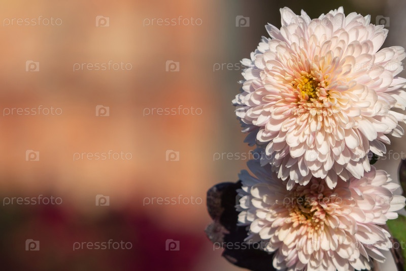 Розовые и белые хризантемы на темном естественном размытом фоне, выборочный фокус. Красивые цветки хризантемы крупным планом в саду. Цветущие хризантемы, винтажный цветочный фон