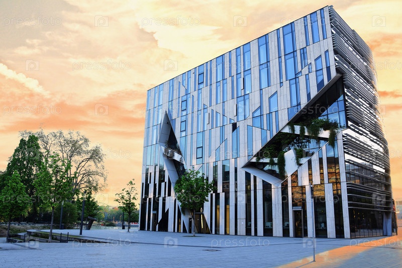 Стеклянное здание на городской улице возле пруда