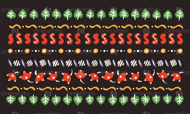Набор этнических элементов. Бордюр представляет собой полосу с цветами, листьями, ветками, вензелями. Народная вышивка. Славянский, украинский, русский мотив. Хохлома, матрешка, дымковская игрушка. Мексиканский, индийский, цыганский ковер. Вязаное кружево