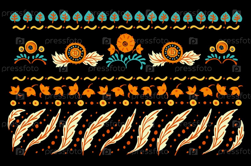 Набор этнических элементов. Бордюр представляет собой полосу с цветами, листьями, ветками, вензелями. Народная вышивка. Славянский, украинский, русский мотив. Хохлома, матрешка, дымковская игрушка. Мексиканский, индийский, цыганский ковер. Вязаное кружево