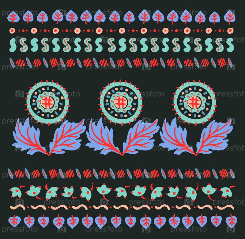 Набор этнических элементов. Бордюр представляет собой полосу с цветами, листьями, ветками, вензелями. Народная вышивка. Славянский, украинский, русский мотив. Хохлома, матрешка, дымковская игрушка. Мексиканский, индийский, цыганский ковер. Вязаное кружево