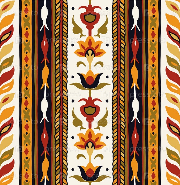Геометрический дамасский орнамент. Икат границы. Этническая вышивка с листьями и монограммами. Племенная векторная текстура. Бесшовный народный узор в ацтекском стиле. Индийский, скандинавский, цыганский, мексиканский, африканский ковер