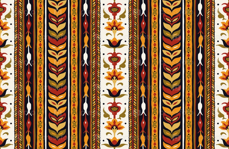 Геометрический дамасский орнамент. Икат границы. Этническая вышивка с листьями и монограммами. Племенная векторная текстура. Бесшовный народный узор в ацтекском стиле. Индийский, скандинавский, цыганский, мексиканский, африканский ковер