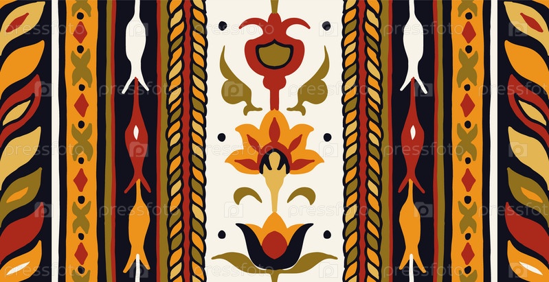 Геометрический дамасский орнамент. Икат границы. Этническая вышивка с листьями и монограммами. Племенная векторная текстура. Бесшовный народный узор в ацтекском стиле. Индийский, скандинавский, цыганский, мексиканский, африканский ковер