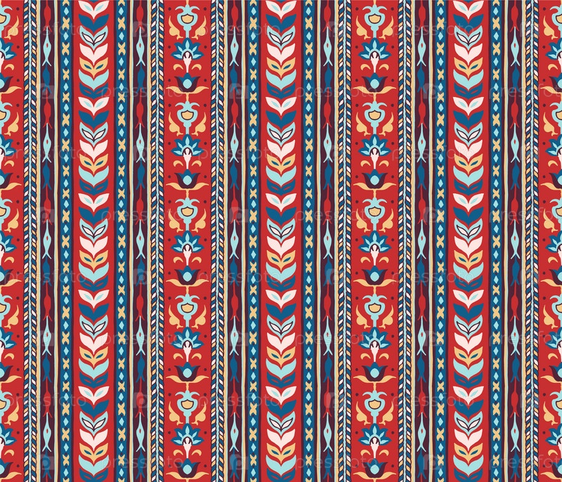 Геометрический дамасский орнамент. Икат границы. Этническая вышивка с листьями и монограммами. Племенная векторная текстура. Бесшовный народный узор в ацтекском стиле. Индийский, скандинавский, цыганский, мексиканский, африканский ковер