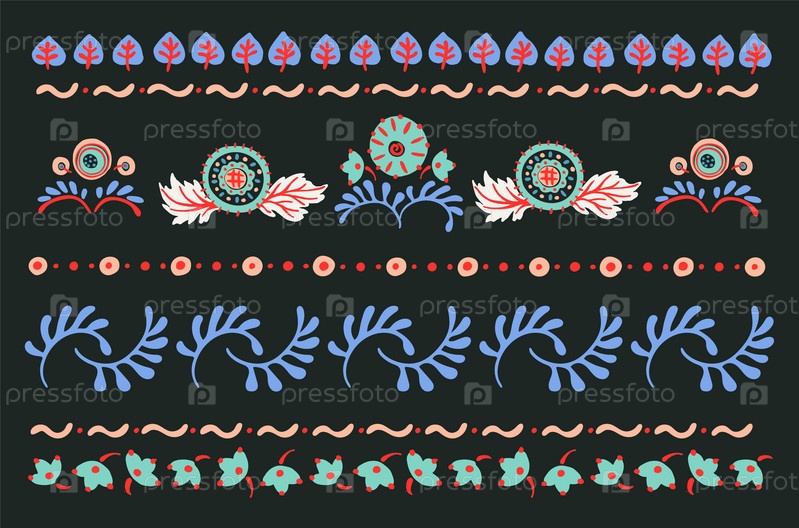 Набор этнических элементов. Бордюр представляет собой полосу с цветами, листьями, ветками, вензелями. Народная вышивка. Славянский, украинский, русский мотив. Хохлома, матрешка, дымковская игрушка. Мексиканский, индийский, цыганский ковер. Вязаное кружево