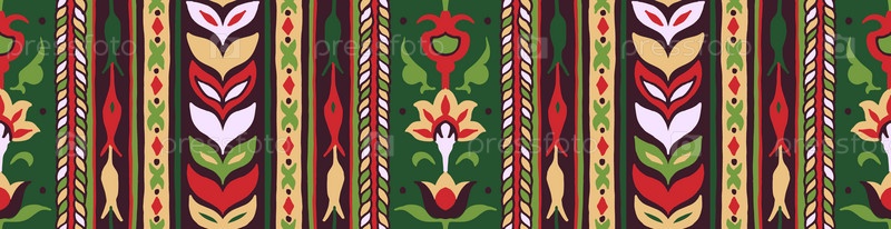 Геометрический дамасский орнамент. Икат границы. Этническая вышивка с листьями и монограммами. Племенная векторная текстура. Бесшовный народный узор в ацтекском стиле. Индийский, скандинавский, цыганский, мексиканский, африканский ковер