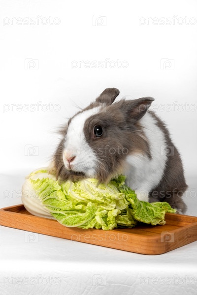 Портрет серого кролика с зеленой капустой на белом фоне. Домашний кролик ест капусту и смотрит в сторону