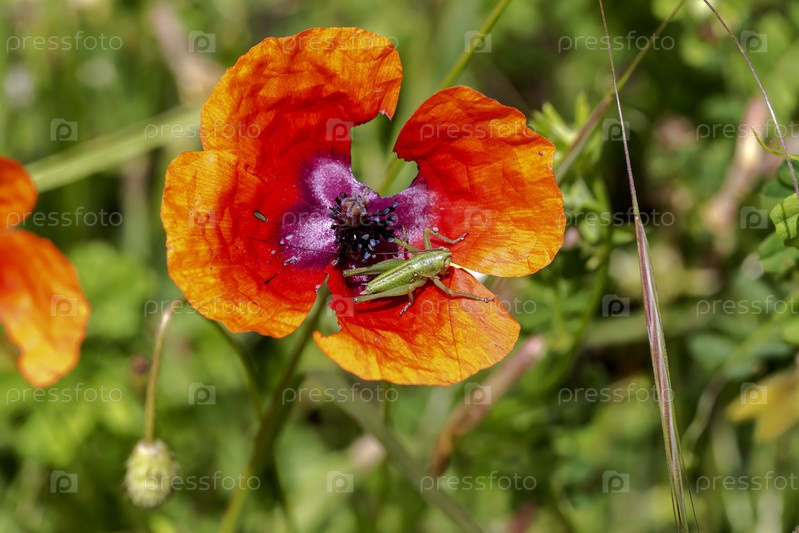 Черепаха (Tettigonia cantans) сидит на красной маке в крупном плане