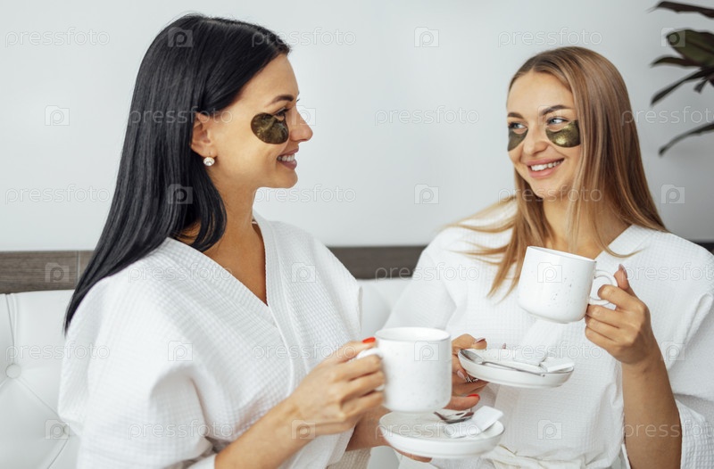Две молодые клиентки салона красоты в белых халатах пьют чай и болтают между спа-процедурами