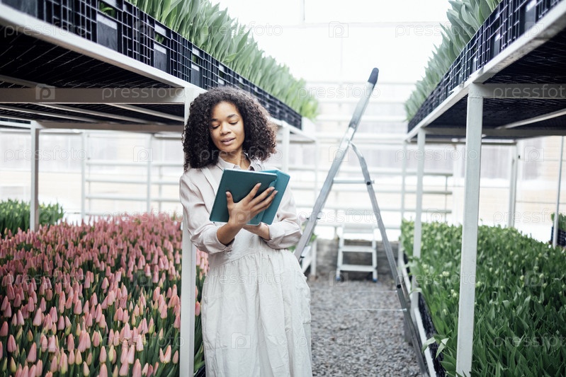 Молодая улыбающаяся женщина смешанной расы использует цифровой планшет для выращивания тюльпанов разного типа