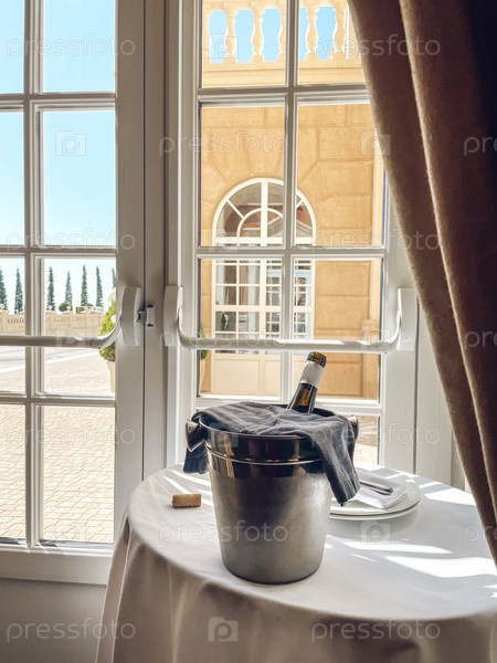 Стол с белой скатертью, тарелками, салфетками и охладителем льда с темной стеклянной бутылкой вина
