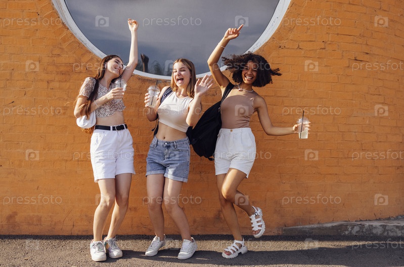 Крупный план трех девочек-подростков в повседневной одежде, пьющих вкусный лимонад на ходу