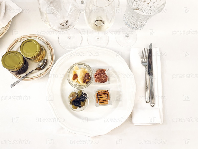 Белая фарфоровая тарелка с вкусными закусками. Оливки, сыр, миндаль, ветчина в отдельных стеклянных мисках