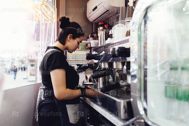 Молодая бариста в перчатках готовит кофе. Брюнетка наливает взбитое молоко для коктейля в бумажный стаканчик