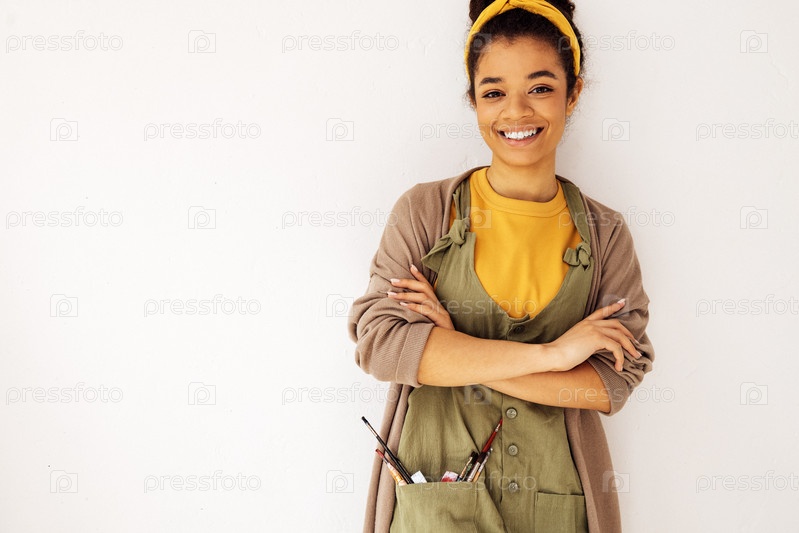 Очаровательная улыбающаяся художница африканского происхождения скрестила руки на груди. Кисти в кармане комбинезона