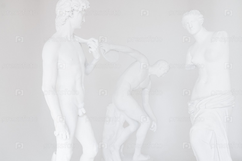 Группа гипсовых статуй на белом фоне. Склеенные мраморные скульптуры метателя диска, Давида и Венеры