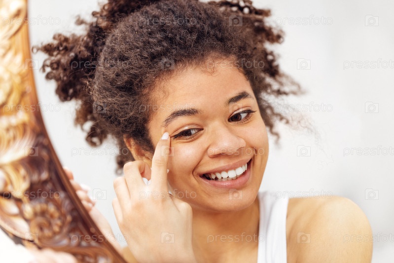Крупный план портрета очаровательной молодой афроамериканки, поправляющей макияж в зеркале