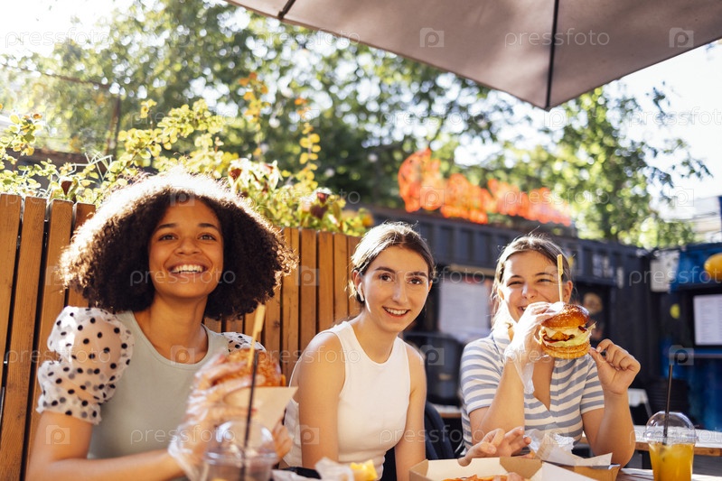 Милые улыбающиеся девочки-подростки сидят в кафе под открытым небом и едят фаст-фуд