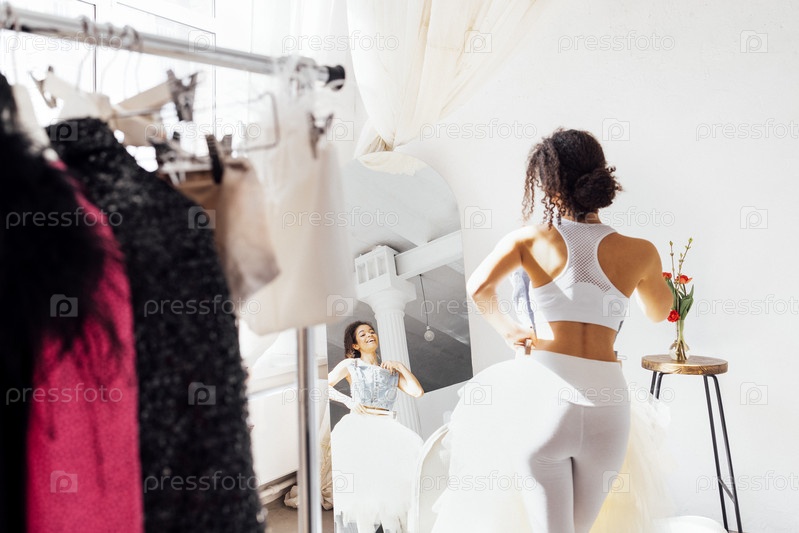 Очаровательная улыбающаяся милая африканская девушка в белом топе и leggings от trempels со стильной одеждой