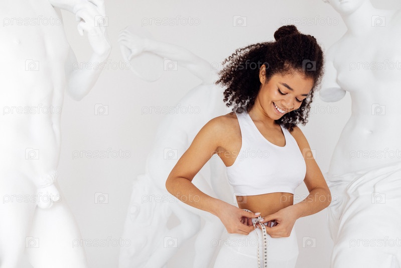 Стройная привлекательная африканская женщина в белой спортивной одежде измеряет талию лентой