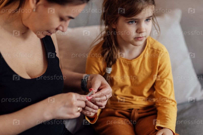 Молодая мать подстригает ногти на руках своей милой дочери маленькими детскими ножницами