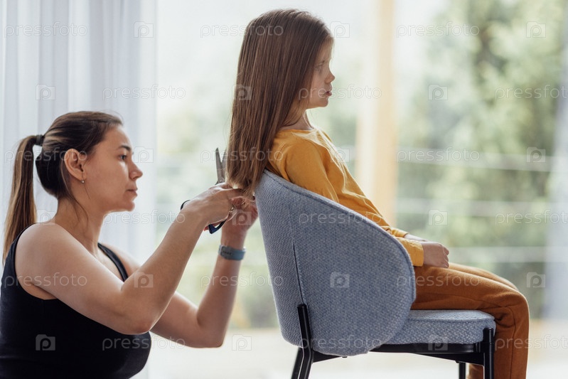 Молодая улыбающаяся мать стрижет волосы своей милой маленькой дочери