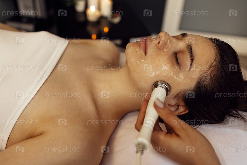 Крупный план лица красивой расслабляющей девушки, проходящей процедуру аппаратной косметологии в спа-салоне