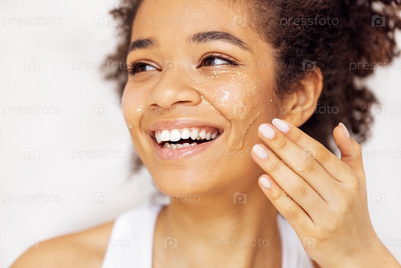 Крупный план портрета очаровательной афроамериканки, наносящей на щеки прозрачный блестящий гель