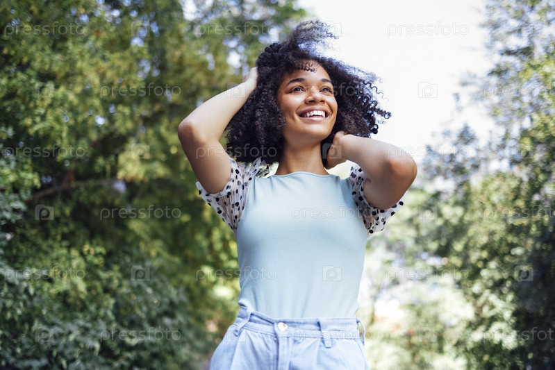 Счастливая афроамериканская девочка-подросток в повседневной одежде. Улыбающаяся темнокожая девочка-подросток гуляет в парке. Летнее время