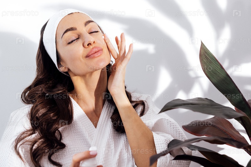 Счастливая брюнетка в белом халате заботится о своей коже и увлажняет лицо кремом