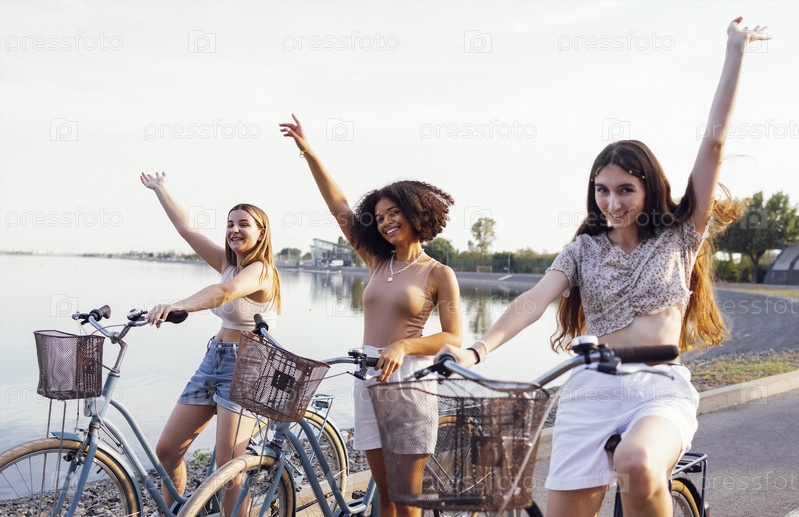 Подростки разных национальностей и внешности на велосипедах едут по улице города