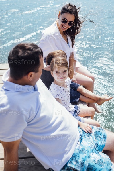 Счастливая семья на деревянном мосту на фоне моря или озера