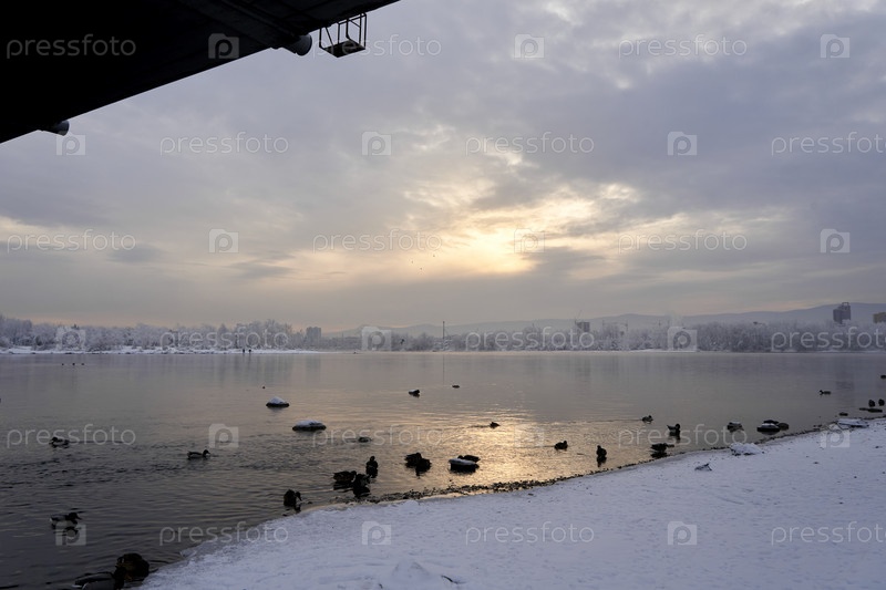 Морозное туманное зимнее утро над Енисеем в центре Красноярска