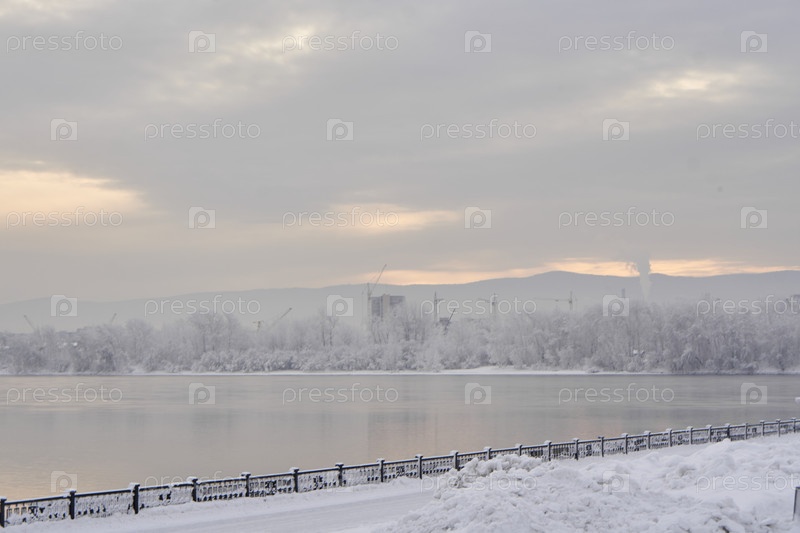 Морозное туманное зимнее утро над Енисеем в центре Красноярска
