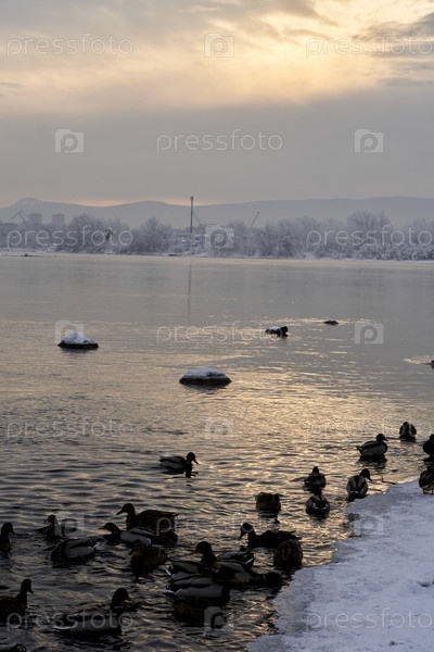 Морозное туманное зимнее утро над Енисеем в центре Красноярска