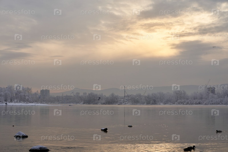 Морозное туманное зимнее утро над Енисеем в центре Красноярска