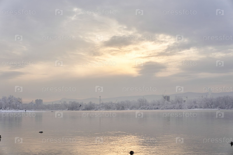 Морозное туманное зимнее утро над Енисеем в центре Красноярска