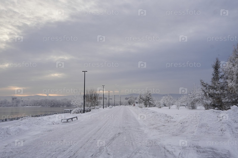 Морозное туманное зимнее утро над Енисеем в центре Красноярска