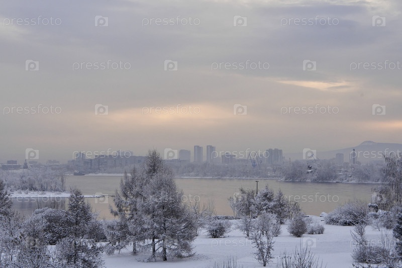 Морозное туманное зимнее утро над Енисеем в центре Красноярска