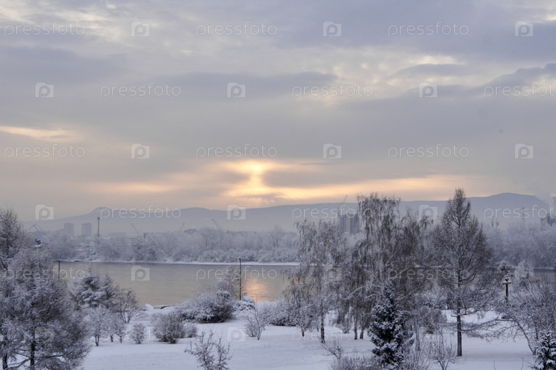 Морозное туманное зимнее утро над Енисеем в центре Красноярска