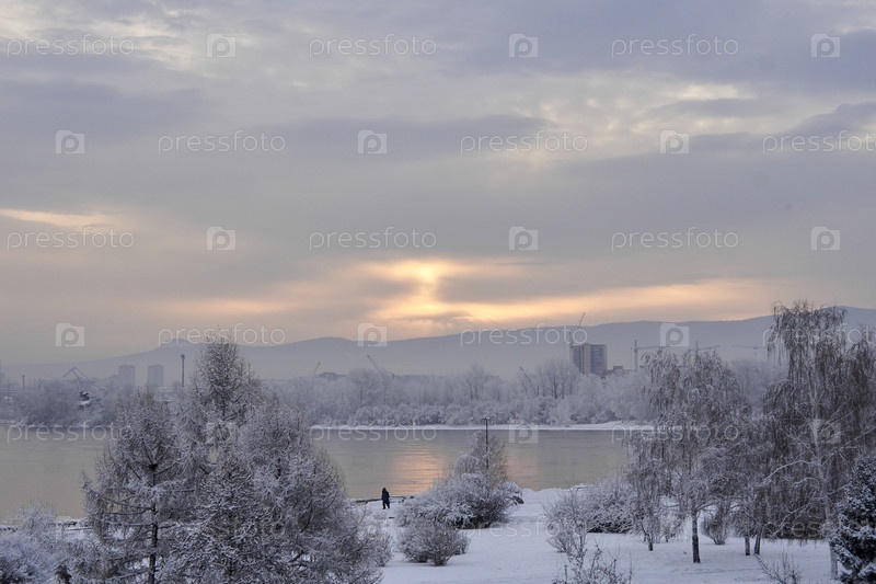 Морозное туманное зимнее утро над Енисеем в центре Красноярска