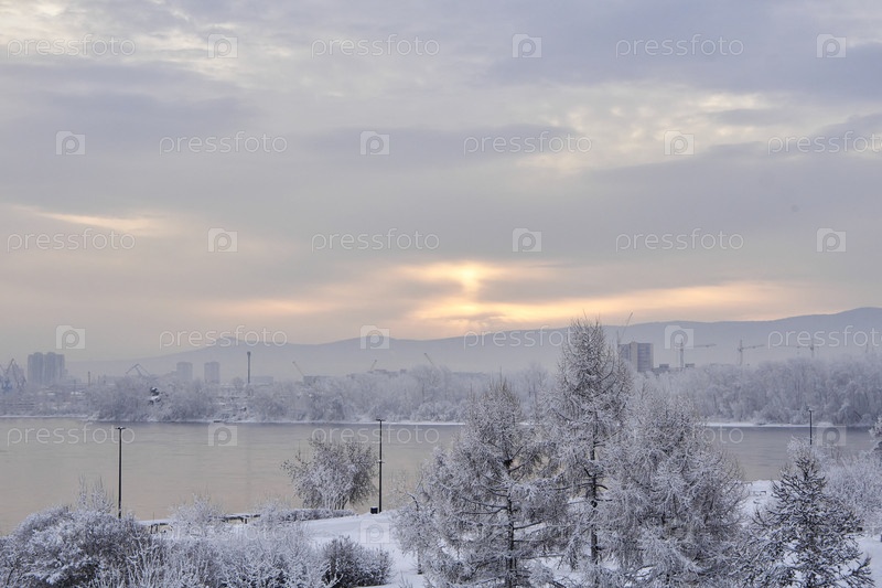 Морозное туманное зимнее утро над Енисеем в центре Красноярска