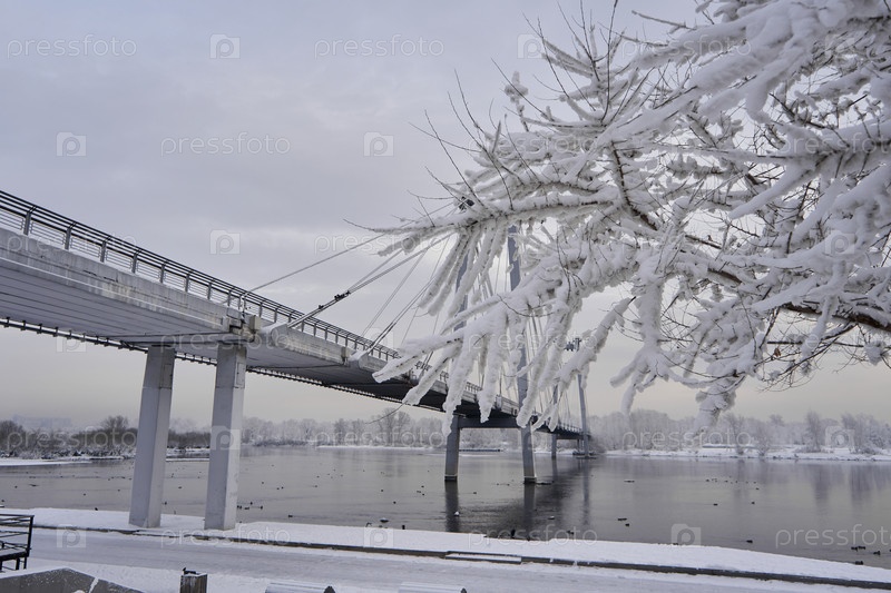 Морозное туманное зимнее утро над Енисеем в центре Красноярска